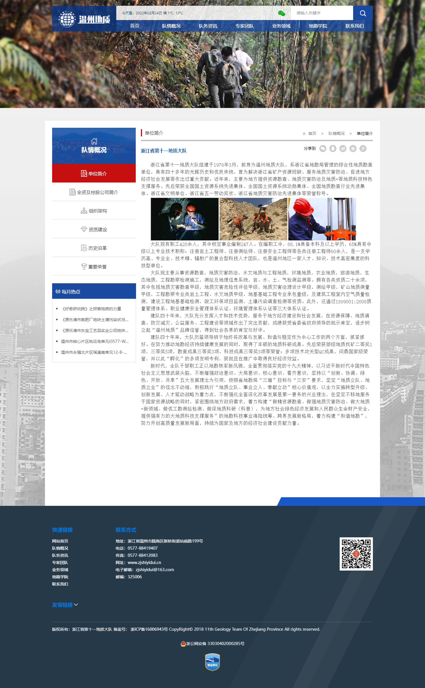 浙江省第十一地質(zhì)大隊(duì)組建于1978年3月,前身為溫州地質(zhì)大隊(duì),系浙江省地勘局管理的綜合性地質(zhì)勘查單位,具有四十多年的光輝歷史和優(yōu)良傳統(tǒng),曾為解決浙江省礦產(chǎn)資源短缺、服務(wù)地質(zhì)災(zāi)害防治、促進(jìn)地方經(jīng)濟(jì)社會發(fā)展等作出過重大貢獻(xiàn)。近年來,主要為地方提供資源勘查、地質(zhì)災(zāi)害防治及地質(zhì)+等地質(zhì)科技特色支撐服務(wù)。先后榮獲全國國土資源系統(tǒng)先進(jìn)集體、全國國土資源系統(tǒng)功勛集體、全國地質(zhì)勘查行業(yè)先進(jìn)集體、浙江省文明單位、浙江省五一勞動獎狀、浙江省地質(zhì)災(zāi)害防治先進(jìn)集體等榮譽(yù)稱號。
